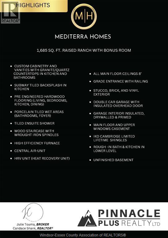 FOR A LIMITED TIME - INTRODUCTORY PRICING!! Welcome to Mayrand Street in the new Villa Oaks Estates Subdivision! The 'Terra' model is a spacious Raised Ranch semi-detached home with bonus room and attached double garage features 3 Bedrooms & 2 Bathrooms in a quiet neighbourhood just minutes from many amenities. Step inside to the bright, welcoming space with hardwood floors in the kitchen all living areas and tile flooring in the foyer and baths. The open floor plan seamlessly connects the living room to the dining area and kitchen, making it ideal for entertaining and family gatherings. The kitchen’s functional layout features plenty of cabinet space, island, solid surface countertops and beautiful coffee bar. The upper level features a large primary bedroom with 4-piece ensuite and walk-in closet- a private oasis! The unfinished basement features a grade entrance, rough-in bath and rough-in kitchen. Located in a desirable LaSalle neighborhood with easy access to local schools, shopping, and major highways. First Time Home Buyer Rebate Applies if eligible-Ask Listing Agent for more details! (id:4555)